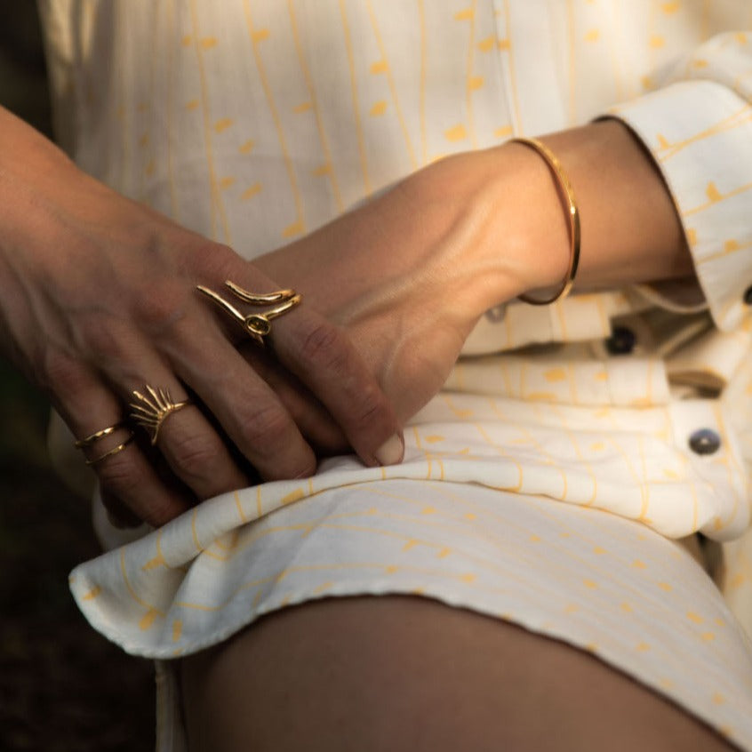This open ring gracefully hugs and elongates your fingers, it unites the elegance of movements of anemones "dancing" in the water with the thorns of some dune plants, developed to defend themselves from predators. Ideal to be stacked with bold statement pieces or delicate solitaires, imparting an effortless charm that eschews any 'preppy' aesthetic. Crafted for comfort, it gently follows the natural contours of your bone structure, providing a snug fit that moves with you.