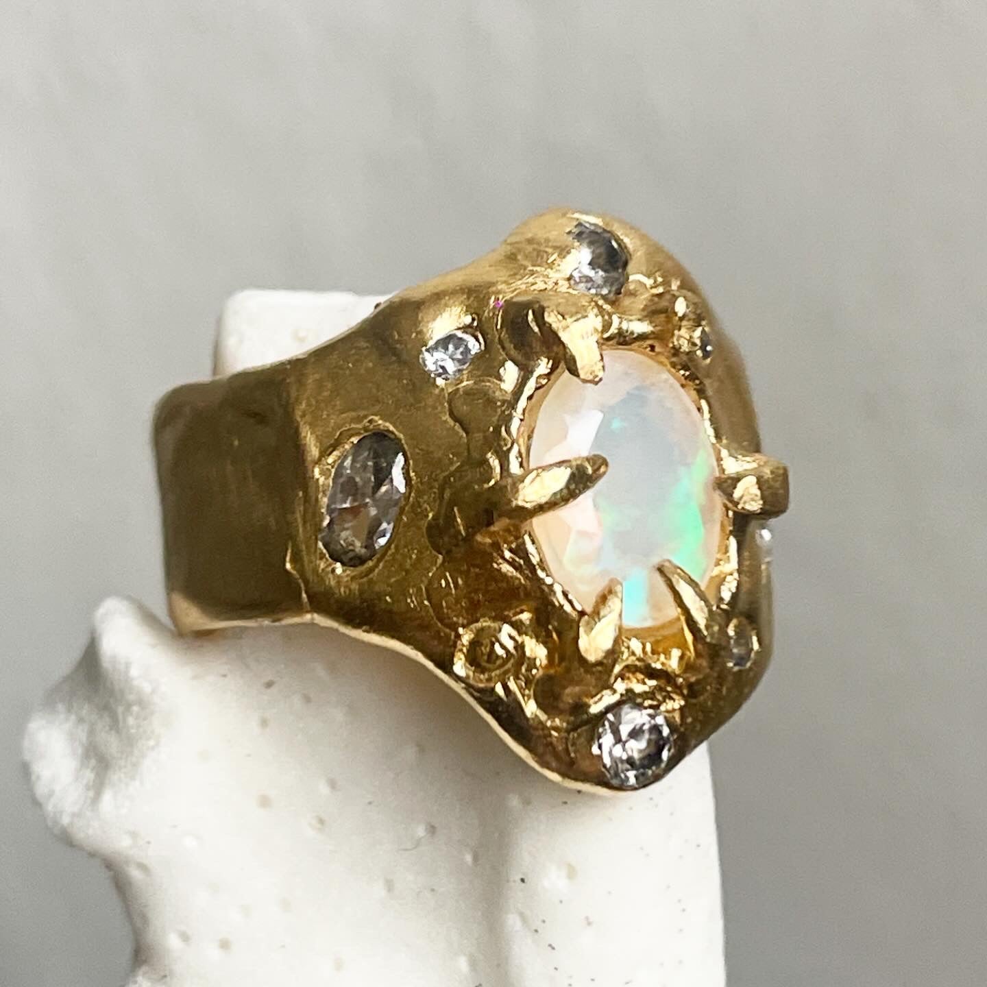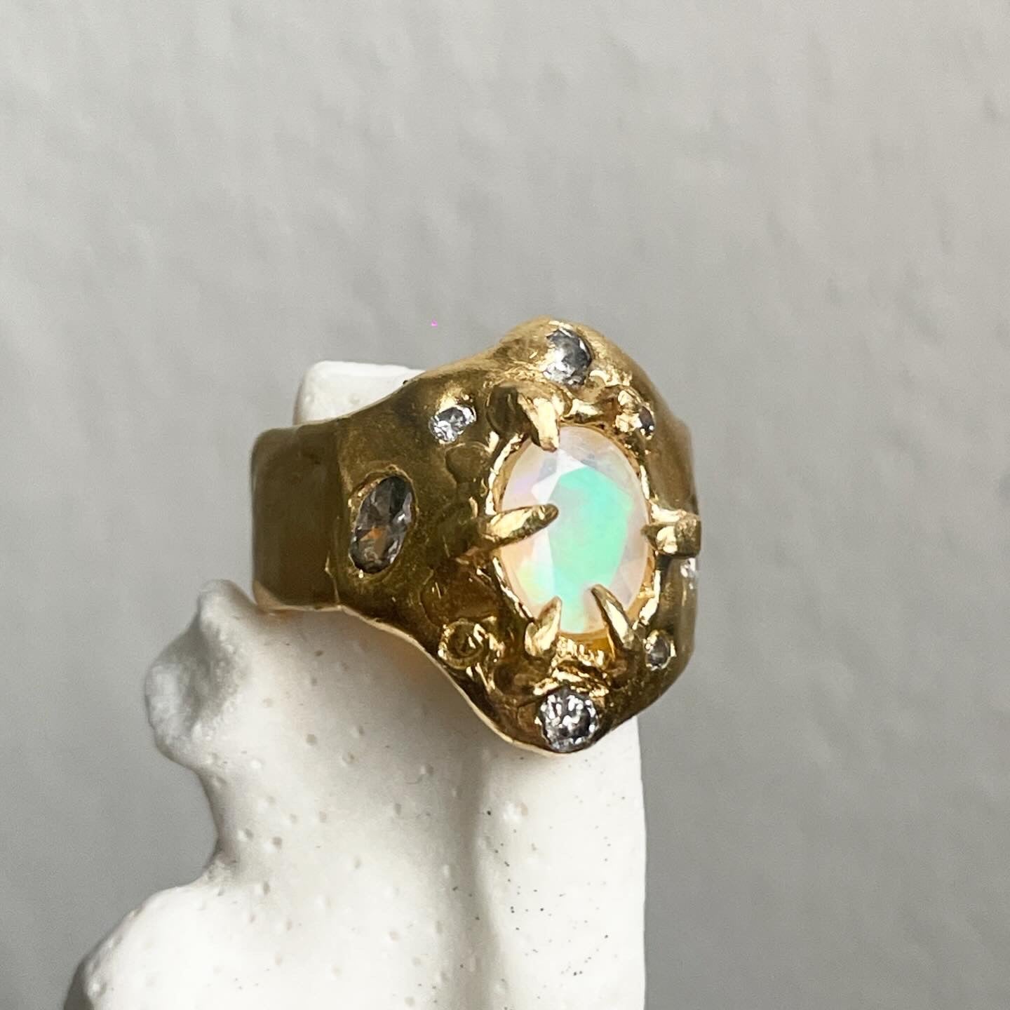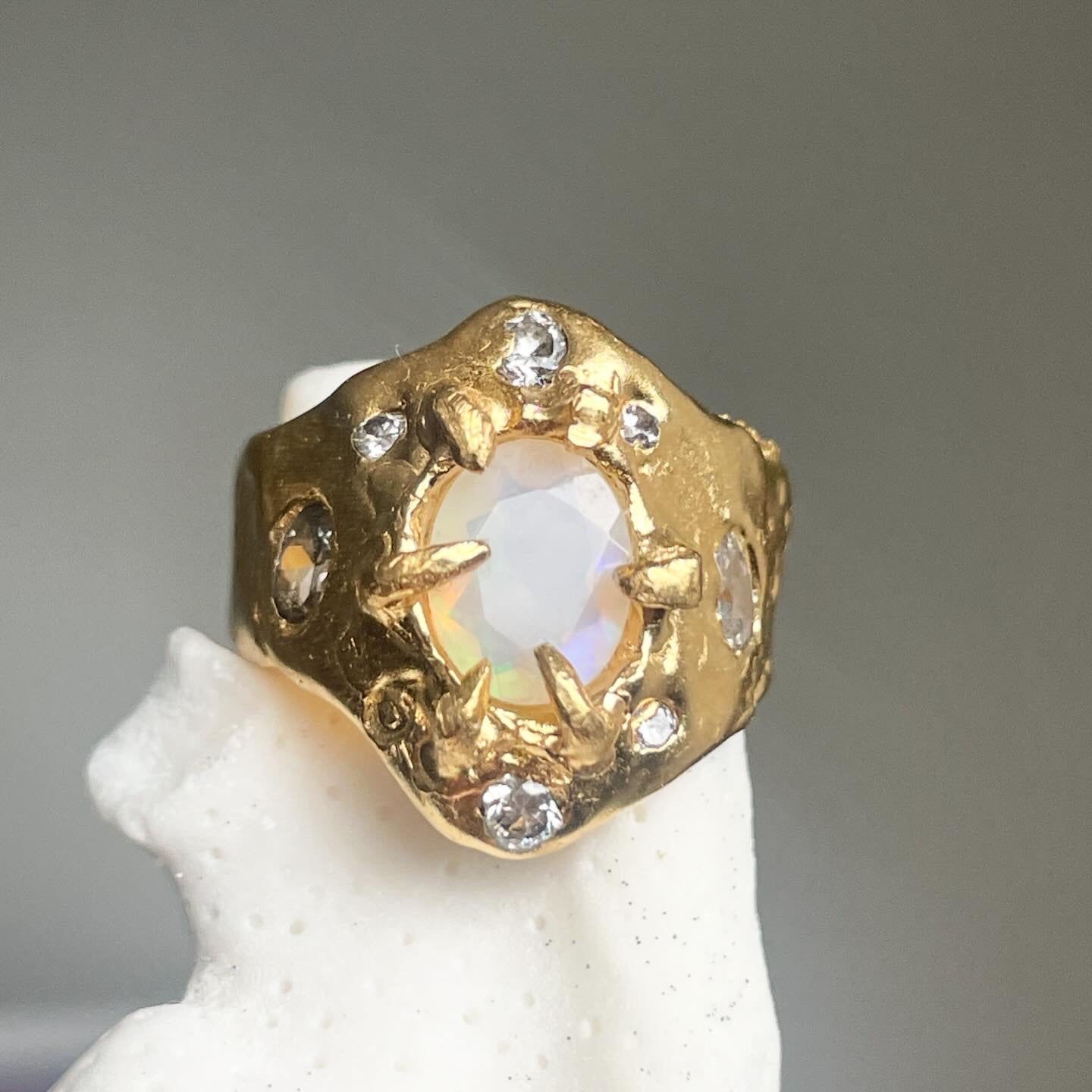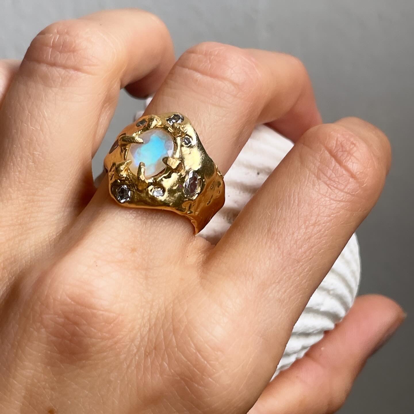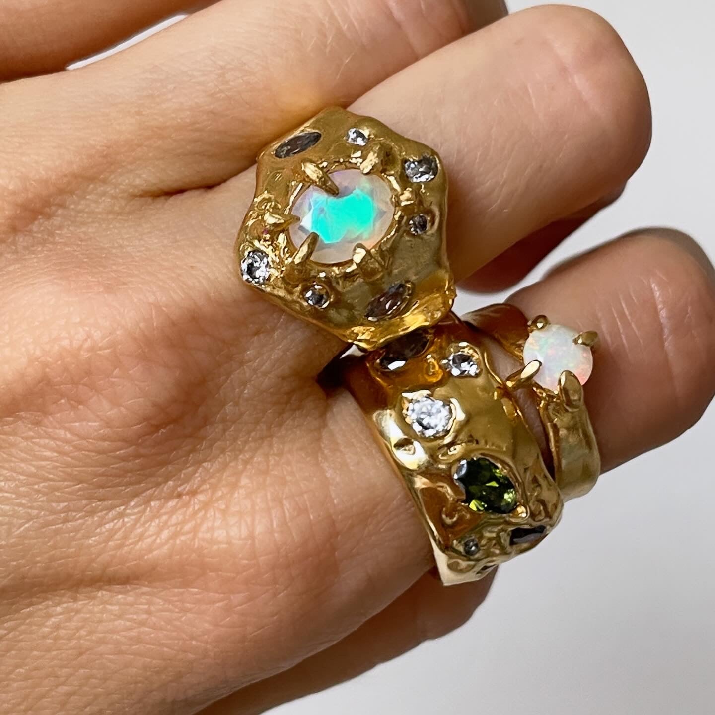 This statement Ring treasures your secrets and unexplored skills: Opal is believed to hold the power to amplify the emotional state and creative skills of the wearer. It is said to help revealing a truer self. It's the gemstone of introspection but also liberation, encouraging you to let go of that which no longer serves you. It enhances self worth, confidence and self-esteem, and helps you to understand your full potential. It also brings lightness and spontaneity and stimulates originality and creativity.