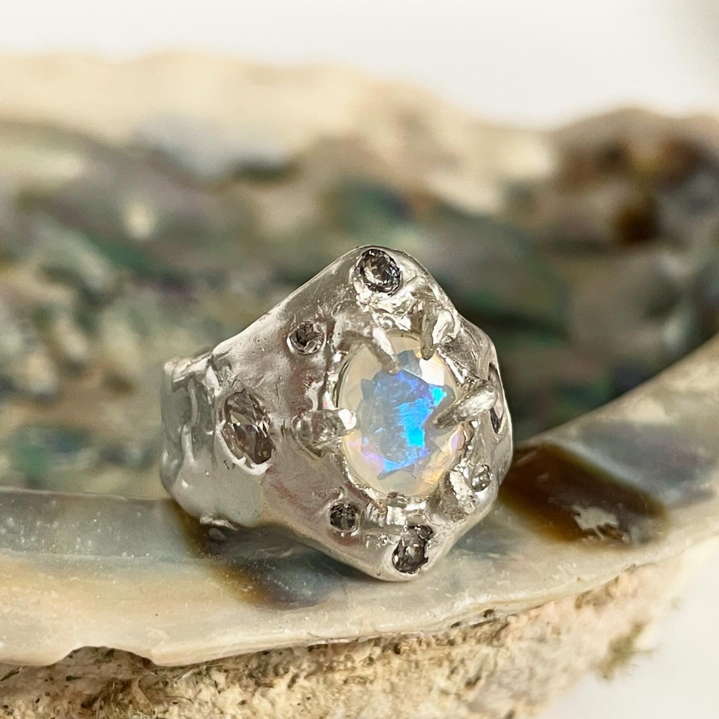 This unique Opal Statement Ring sparkles from the deep of the sea, a bioluminescent creature, a rare finding that lives on the bottom of the ocean and treasures the secrets of the unexplored. The Ethopian Opal as its center changes color according to the light like mother of pearl, a mesmerizing galaxy surrounded by Cubic Zirconia stars and a chunky irregular satin finished broad band.