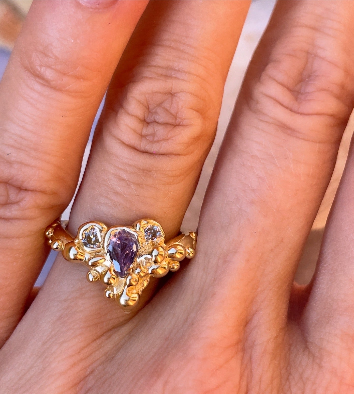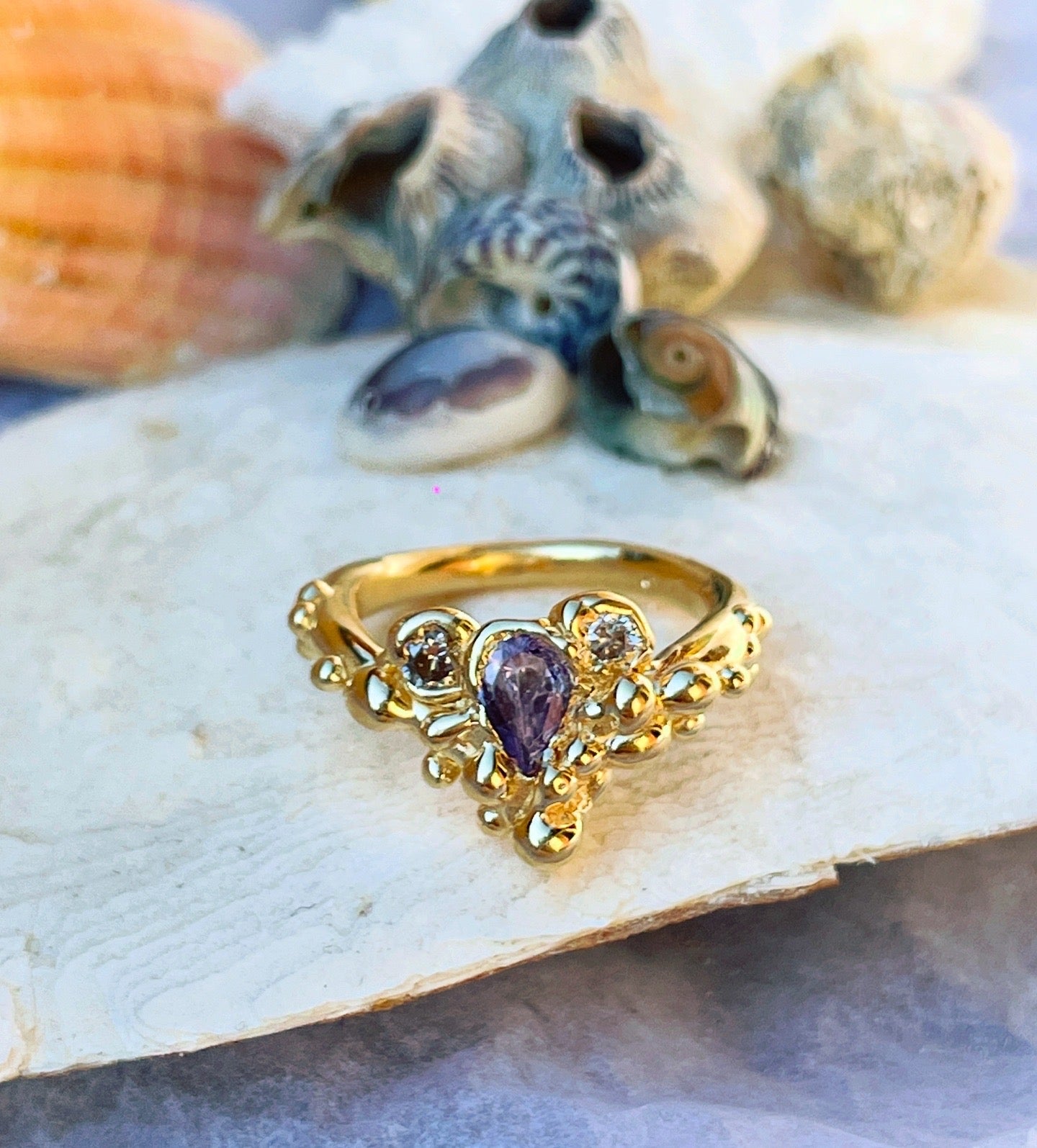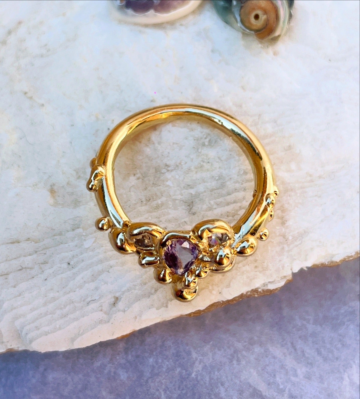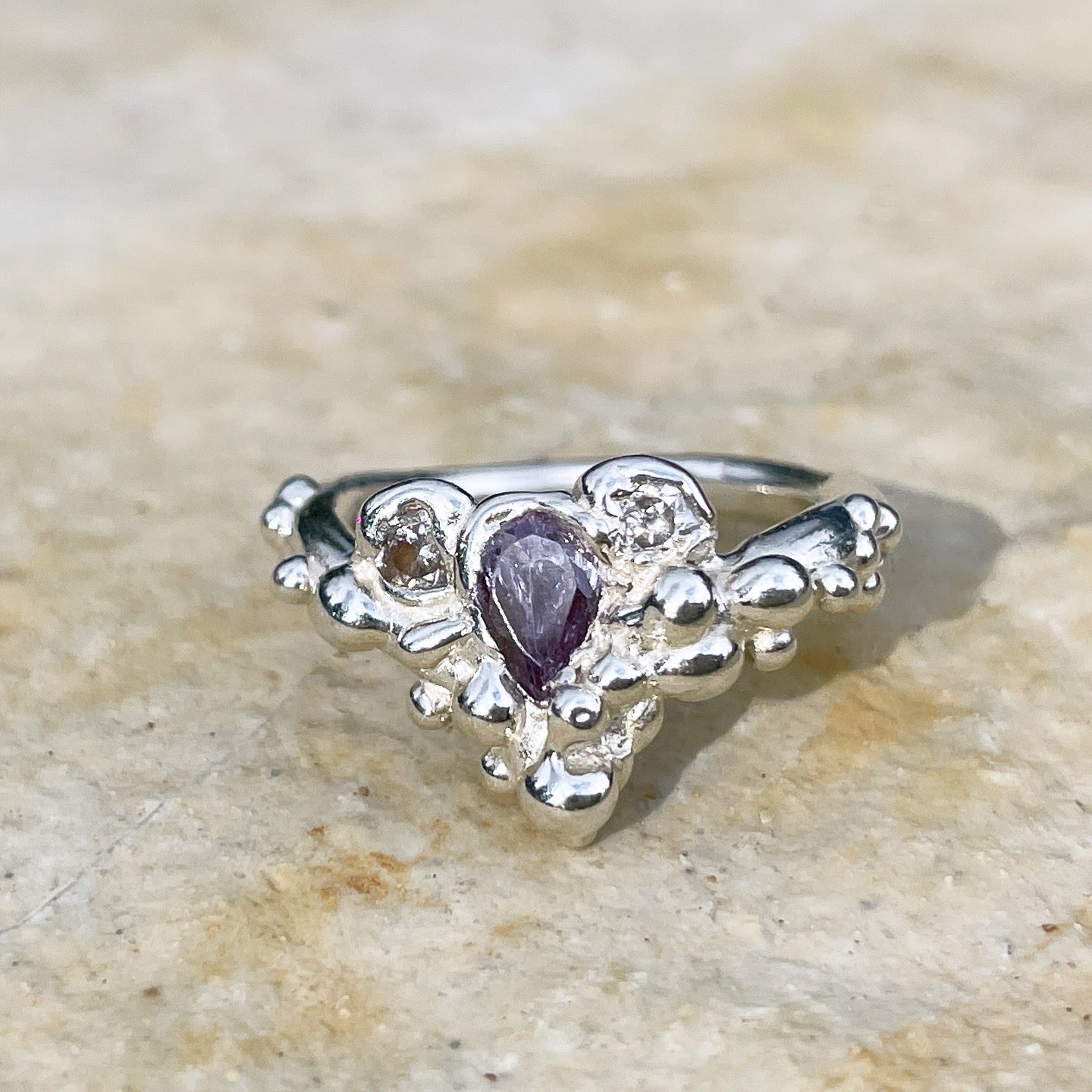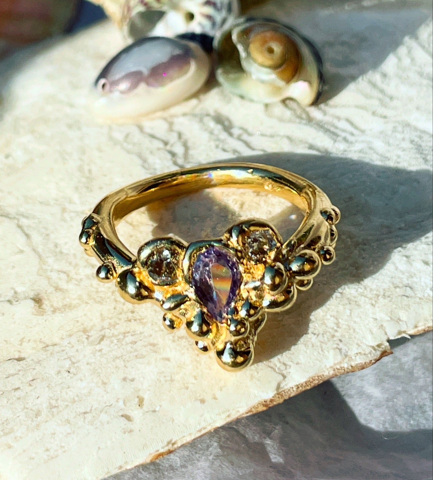 A v-shaped bubble ring encrusted by three sparkling stones, elevating it to a tiny ocean crown. The violet pear shaped central stone is surrounded by two tiny round diamond cut cubic zirconias and has two more tiny gems on the side band.