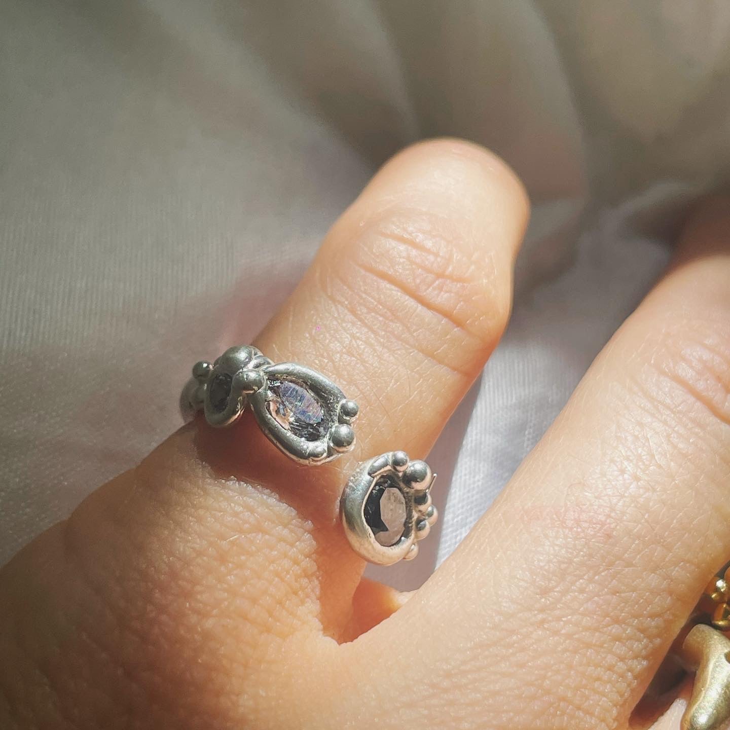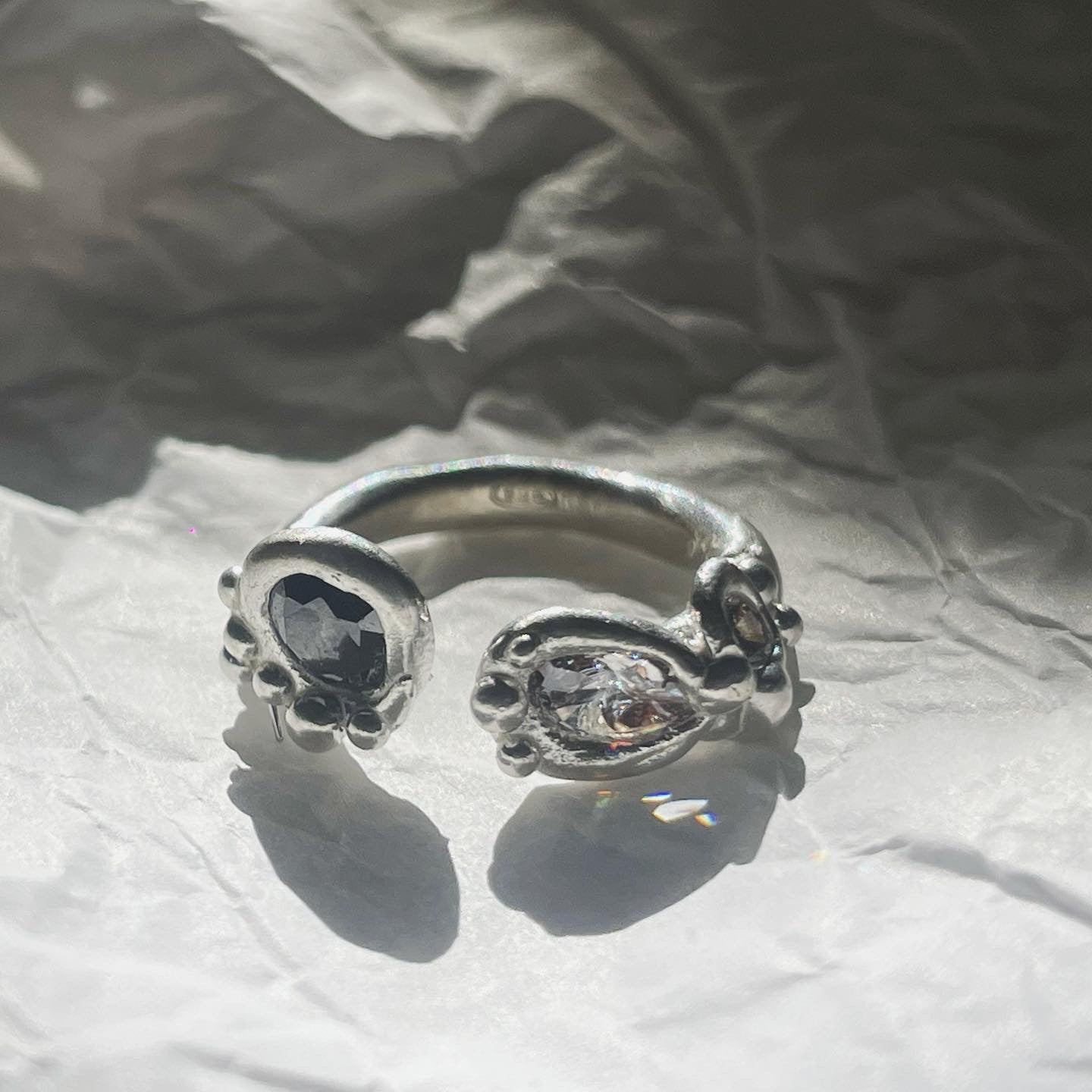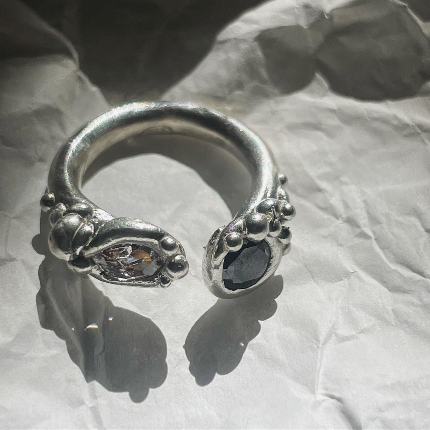 Two spirits barely touching each other like two galaxies that seem to hug and melt into one, but still maintain their own selfs. A black and a white cubic zirconia almost touch in this open ring, a third little star is hidden on the side. Perfect stacking ring to go with, for example, a solitaire.