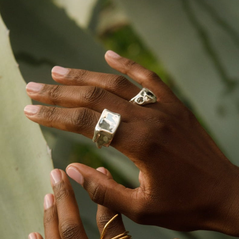 This massive ice cube is melting on your finger, a tribute to the element water, in which we were born and of which we are made. Whether liquid, molten, or iced, its form depends solely on the circumstances. This serves as a reminder that, like water, our ability to adapt and thrive is determined by our environment. This substantial yet surprisingly comfortable ring is here to remember that.