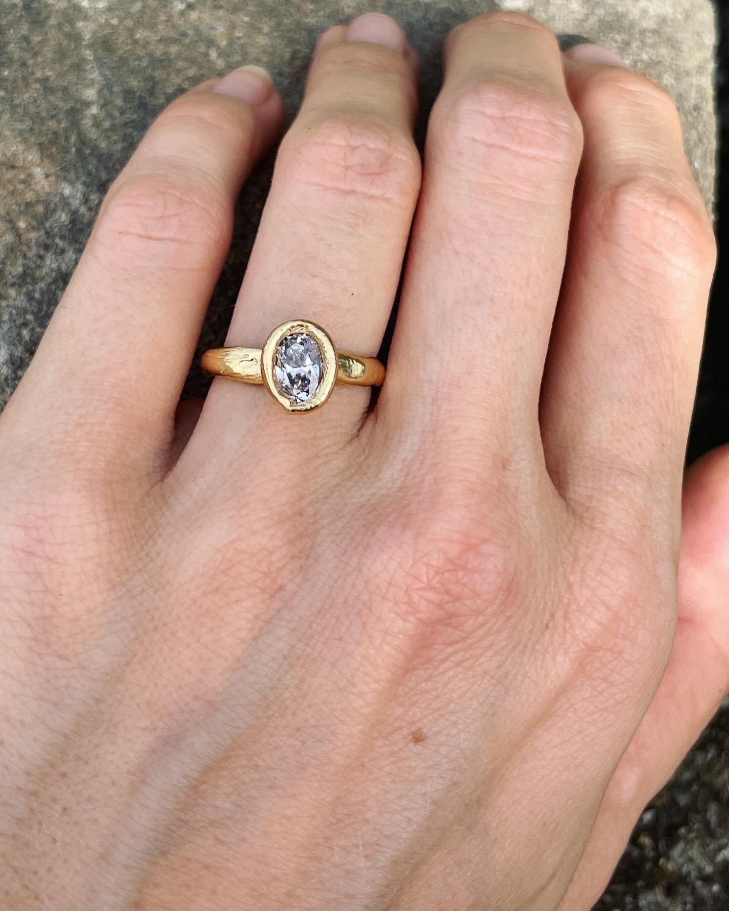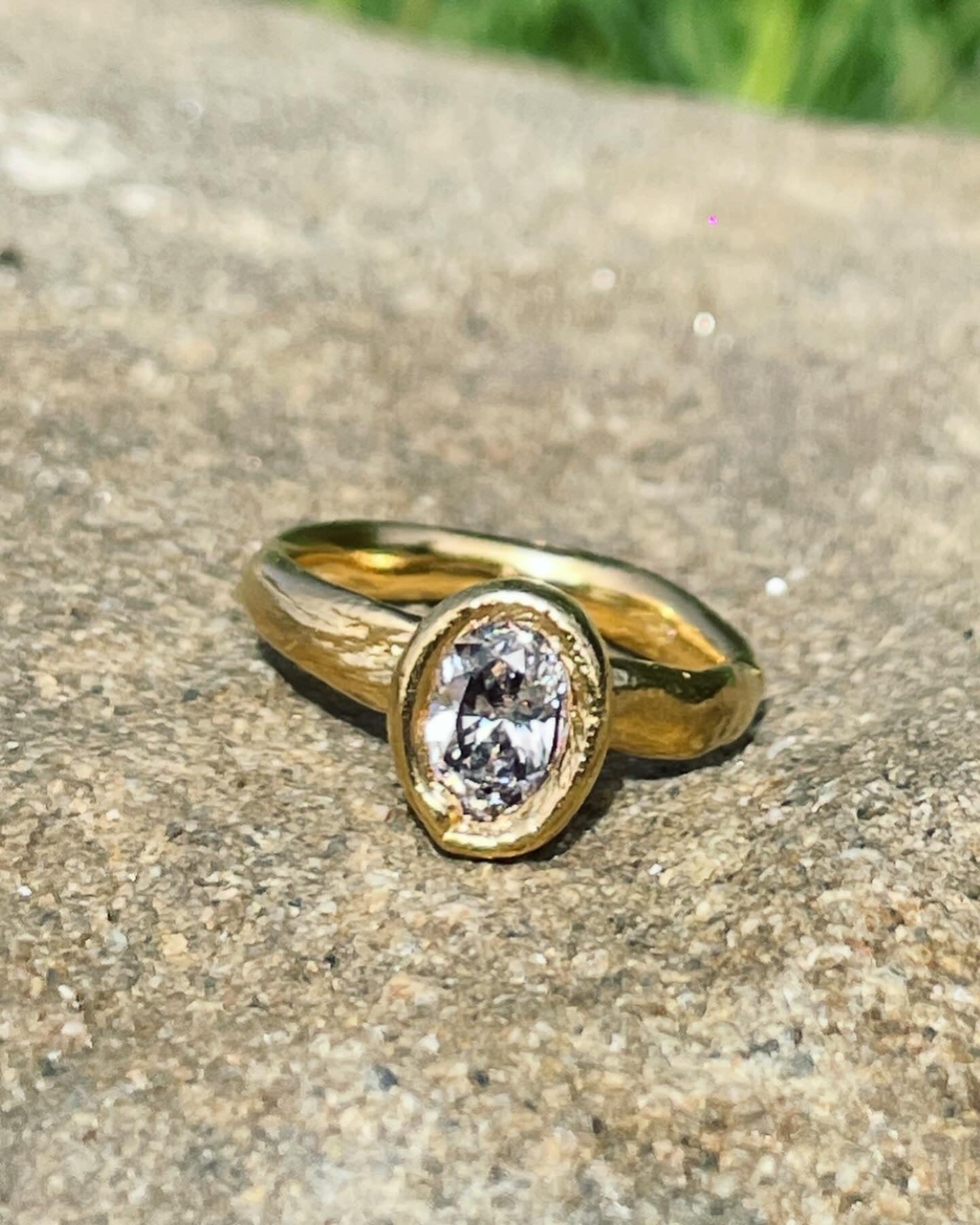 The tiny pebble, a precious finding you discovered on a beach full of pretty stones, is so unique to you that you want to elevate its beauty in a solitaire ring. The fine and classic shape gets its particular look thanks to the irregular band that holds the stone up. Perfect for stacking and combining with a simple band or any kind of v-shaped ring. The Tiny Pebble is an unconventional ceremonial ring, made to celebrate the beauty of the moment but cast to last forever. A great alternative engagement and wedding ring (for full gold options see below or ask me directly).