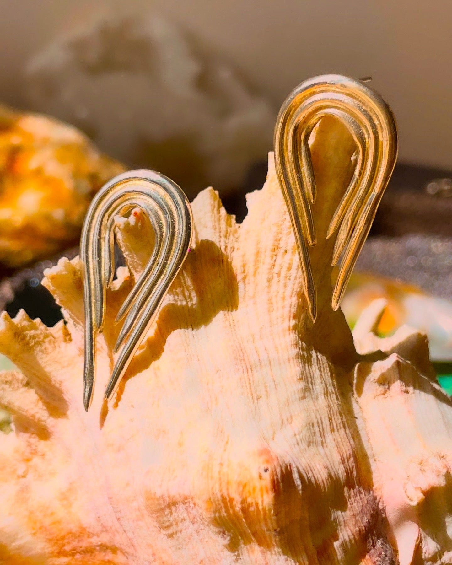 These organic shaped earrings remember the gentle movement of seaweed, the food of the oceans and producer of oxygen, these creatures are underestimated but their importance huge. Lightweight it dances with the waves and the tides, rooted but going with the flow of the water.