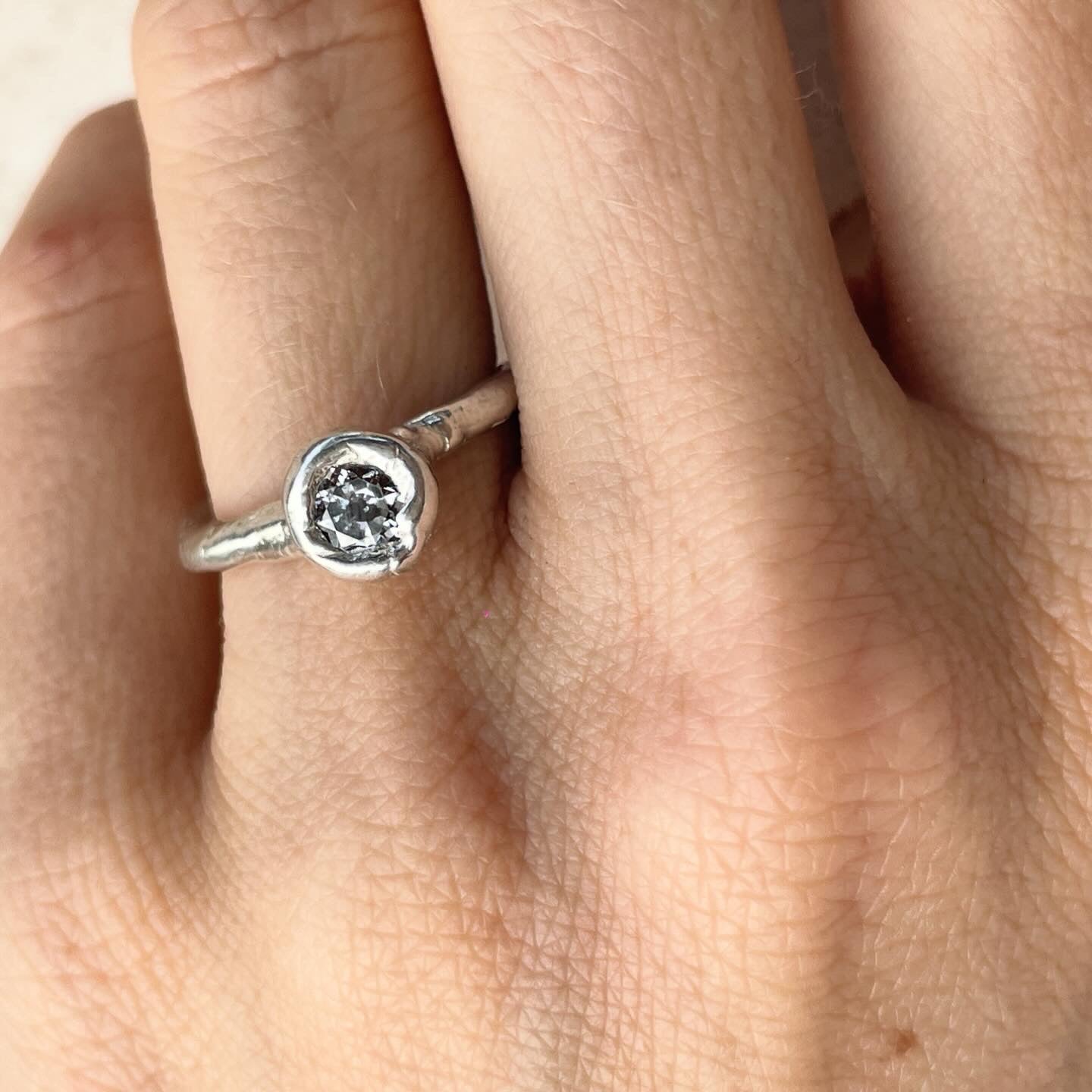 The tiny pebble, a precious finding you discovered on a beach full of pretty stones, is so unique to you that you want to elevate its beauty in a solitaire ring. The fine and classic shape gets its particular look thanks to the irregular band that holds the stone up. Perfect for stacking and combining with a simple band or any kind of v-shaped ring. The Tiny Pebble is an unconventional ceremonial ring, made to celebrate the beauty of the moment but cast to last forever. A great alternative engagement and wedding ring (for full gold options see below or ask me directly).