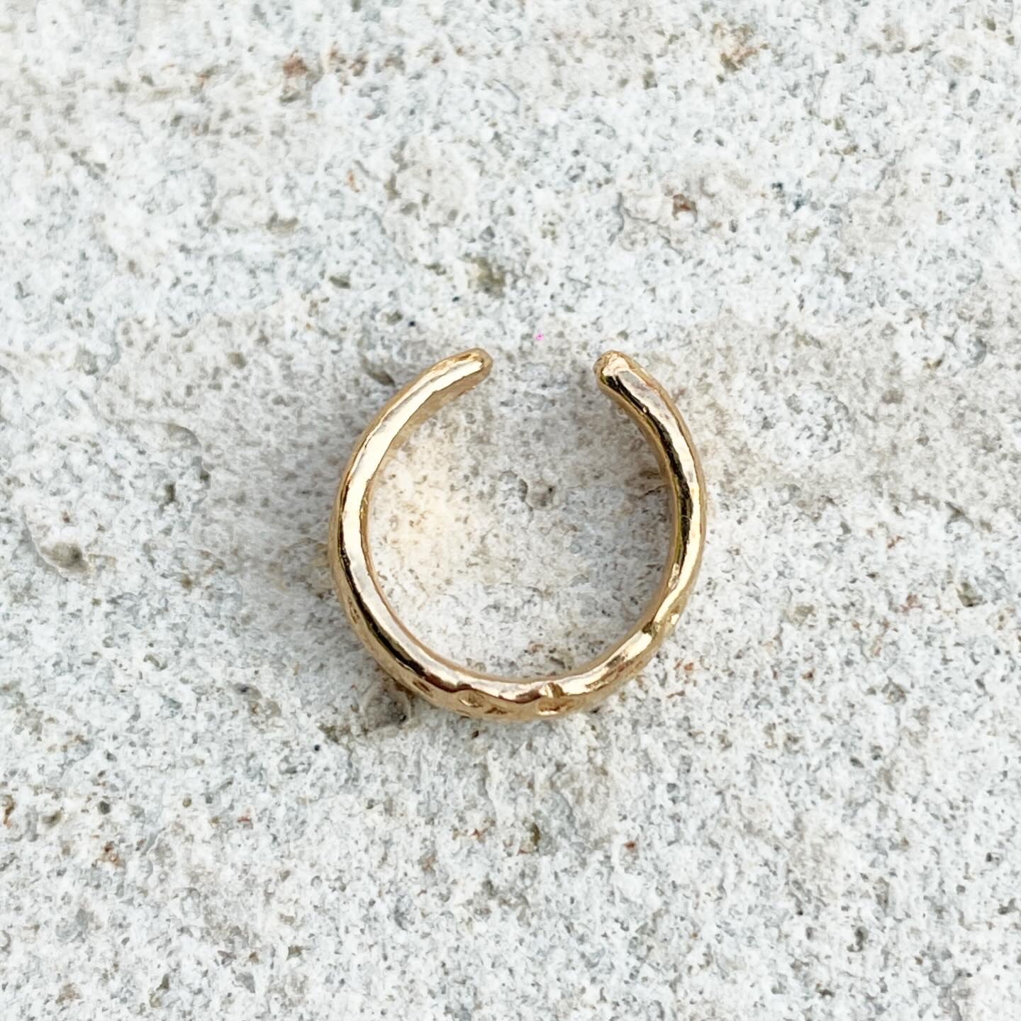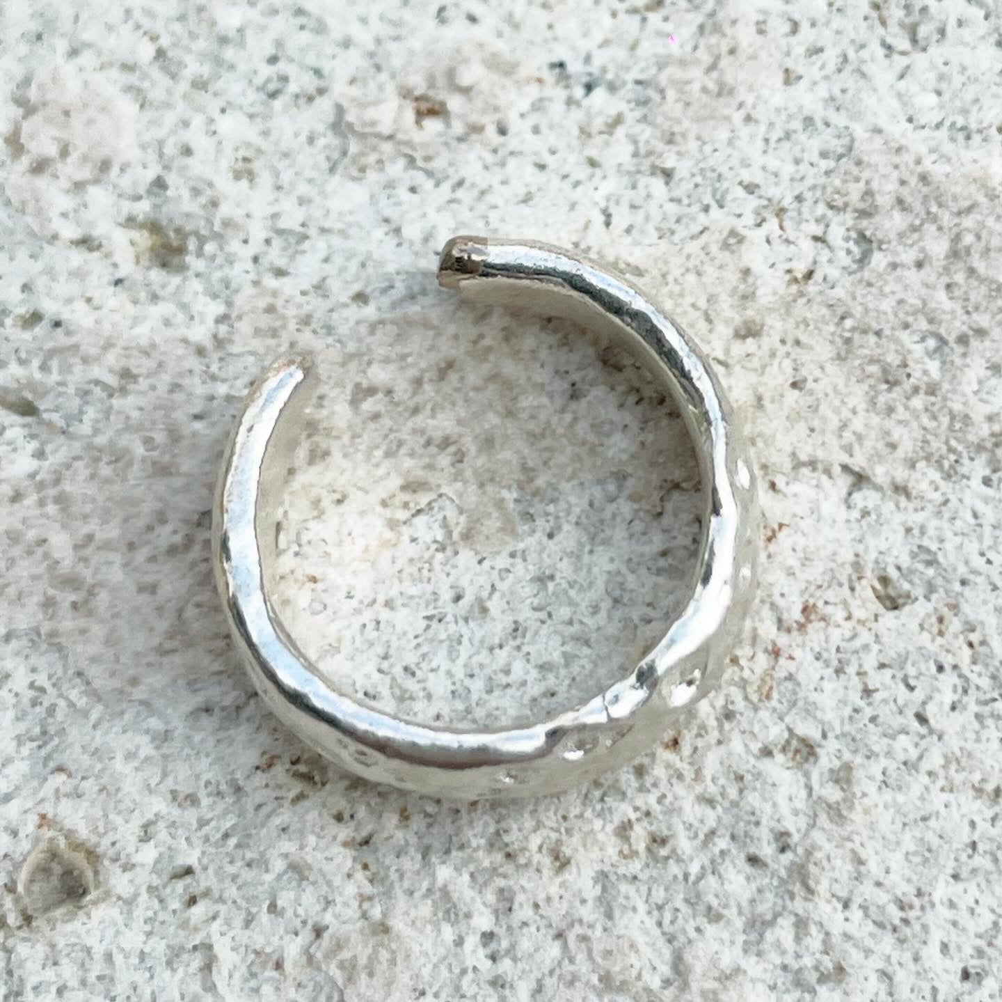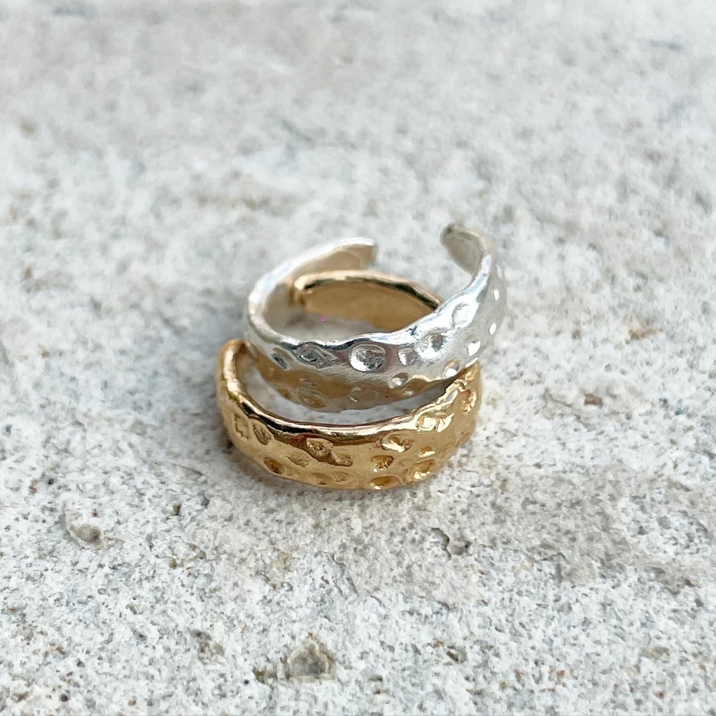 Those tiny ear cuffs are easy to put on and have a good hold, they are light so you do not feel them at all and sightly adjustable. The texture is irregular and reminds of raindrops fallen in beach sand in a war summer day. They are small enough to be stacked with one or two more ear cuffs.