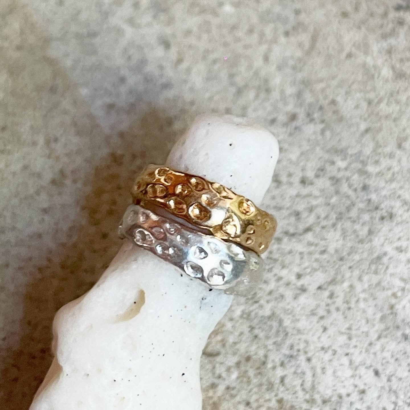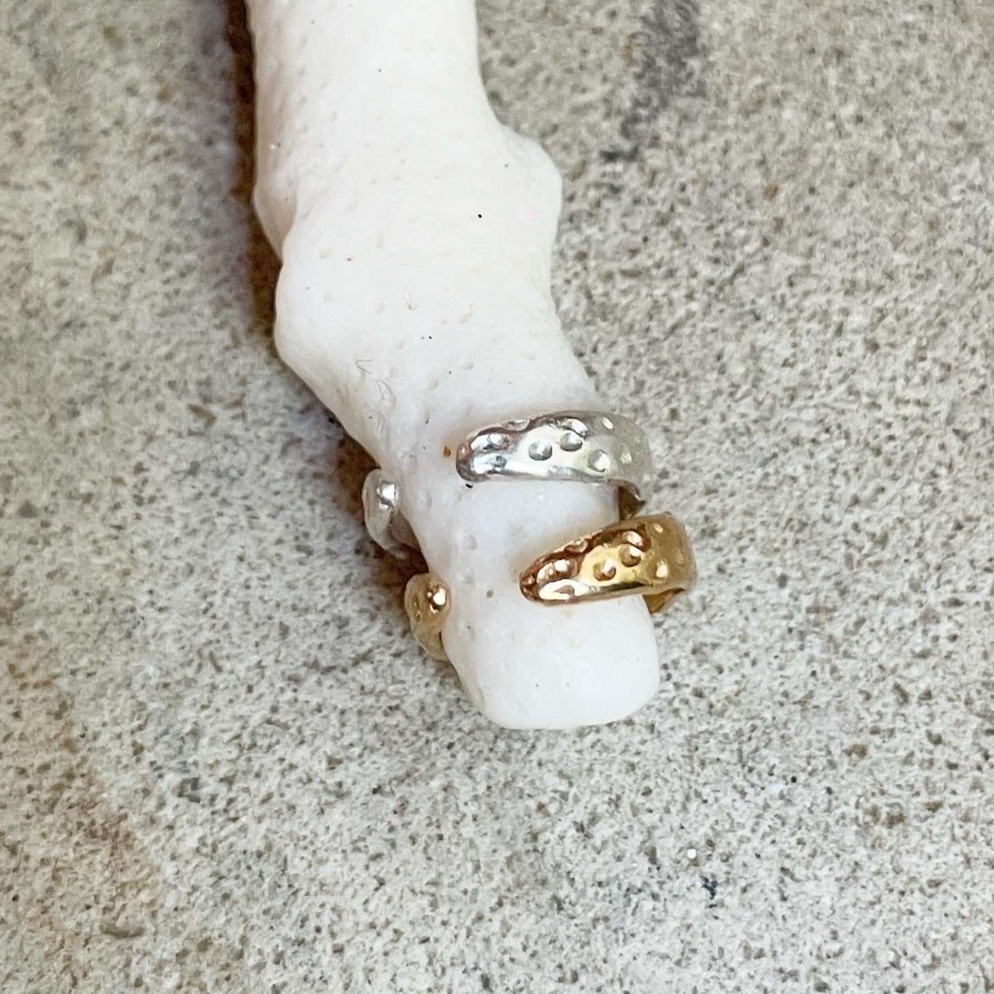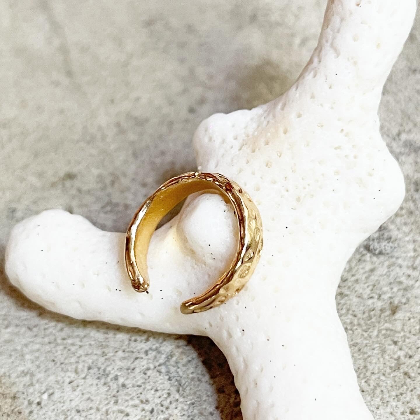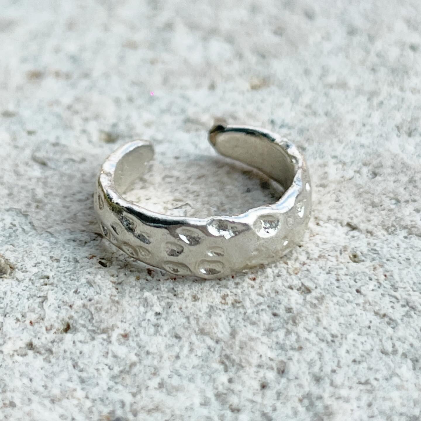 Those tiny ear cuffs are easy to put on and have a good hold, they are light so you do not feel them at all and sightly adjustable. The texture is irregular and reminds of raindrops fallen in beach sand in a war summer day. They are small enough to be stacked with one or two more ear cuffs.